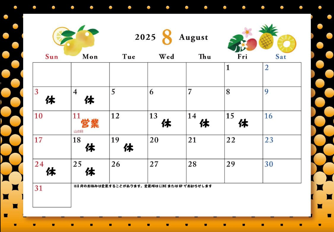 お知らせ 8月の営業について 2025.08.01 Tweet 8月はお盆休みとして13日~15日を休業とさせていただきます。 代わりに11日(祝)は営業いたします。 お盆までにリフレッシュしたい!というみなさま、ご予約をお待ちしております。 Category:当店からのお知らせ Author:belle /blog/blog_comments/captcha/47115757 /blog/blog_comments/get_token ≪ 【利益度外視】お待ちかね!夏の福袋 暑さに負けない!スペシャルケア〜夏限定コース ≫
